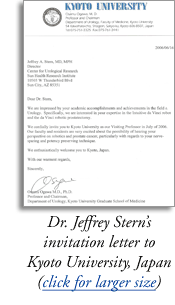 Dr. Jeffrey Stern’s Invitation Letter To Kyoto University, JapanStern explained that robotics in urology uses a computer as an interface between the surgeon and the patient. “Over the last several years, the world has seen an explosive growth of the use of robotics in surgery – but the best is yet to come,” says Stern. “Over the next 10 years we will see exponential technological advances in robotic surgery which will benefit patients in ways we never imagined.”